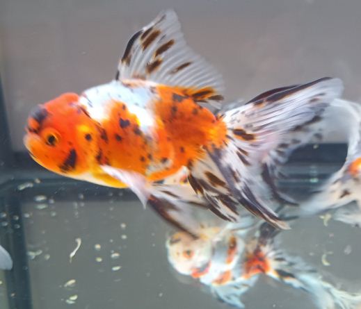 The azuma nishiki is an attractive Calico form of the Oranda - Calico are goldfish of any breed that have a type of scale that is intermediate between the metallic type of scales and the transparent type. These scales have a slight sheen that produces a pearly appearance. form of the oranda. "Azuma Nishiki" was Created by KATOU Kinzou in 1931 Yokohama, and they are now another very popular variety of fancy Goldfish.